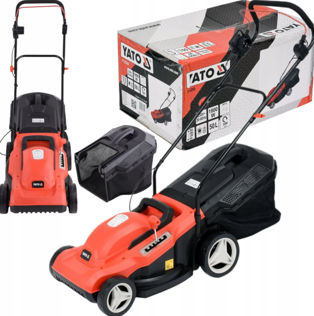 Електрична газонокосарка YATO YT-85205 потужністю 1800 Вт. Дозволяє скошувати траву шириною 380 мм. Він оснащений простим у використанні 6-ступінчастим регулюванням висоти зрізу від 20 до 70 мм і міцним сітчастим травозбірником ємністю 50 літрів. Оснащений міцним кошиком для пресування зрізаної трави, без необхідності її частого спорожнення.